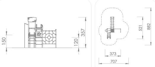 Aktivitetsapparat med mange ulike utfordringer. Aktivitetsapparat har armgang, aktivitetspanel, klatrevegg, brannmannstang, rørstige og klatrenett koblet til to plattformer.