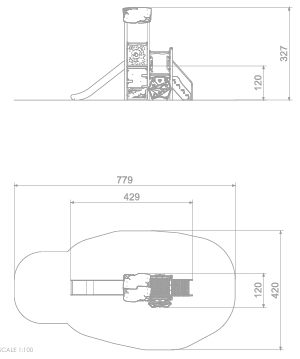 Aktivitetsapparat med plattformer på 2 nivåer, med trapp og rutsjebane, aktivitetspaneler, 2 klatrevegger og et spennende lite krypinn under med handledisk. Artig apparat med spennende elementer.