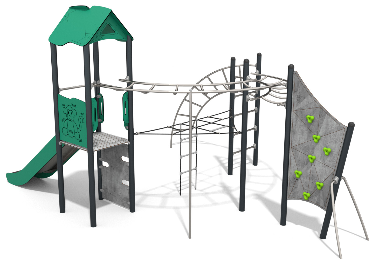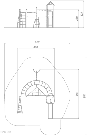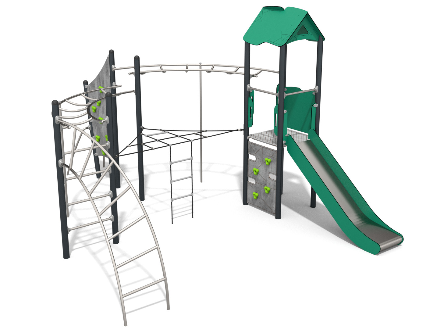 Aktivitetsapparat med liggende klatrenett, klatrestiger, utfordrende armganger, klatrevegger og hus med rutsjebane.