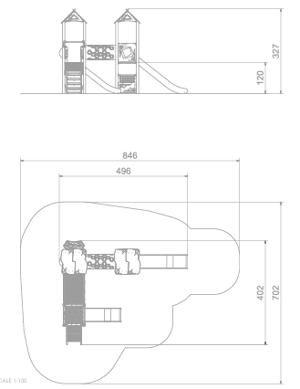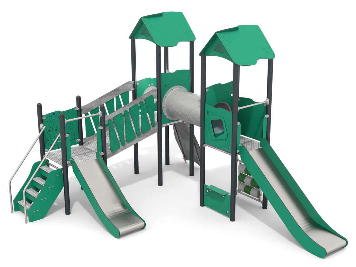 Aktivitetsapparat med 2 hus, gangbro trapp, kryptunnel, klatrevegg, rutsjebane, handledisk og spillpaneler.