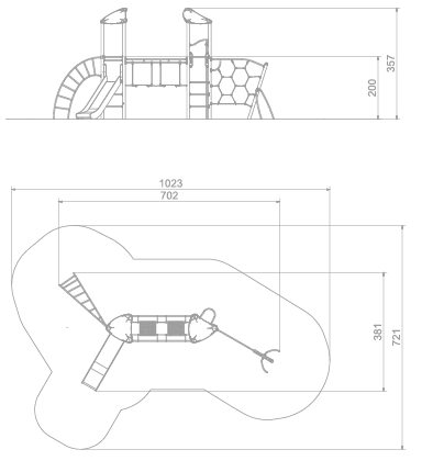 Aktivitetsapparat med to tårn med gangbro, klatrenett, klatretrinn, brannmannstang, klatrestige og rutsjebane.