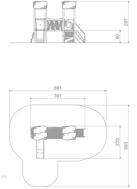 Aktivitetsapparat med to plattformer med gangbro mellom, trapp, handledisk, sklie og vindu.