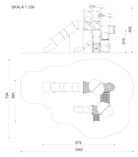 Kombinasjonsapparat med 3 nivåer, stor tunnelsklie, brannmannstang, rutsjebane, trapper, aktivitetspaneler og handledisk.