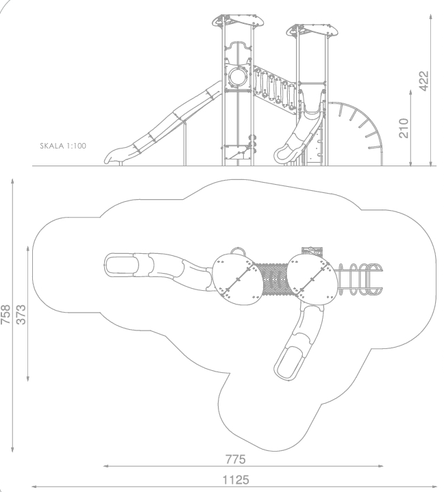 Spennende kombinasjonsapparat/lekesentral med 2 plattformer, 2 rutsjebaner, brannmannstang, klatrevegg, rørstige, handledisk og spillpanel.