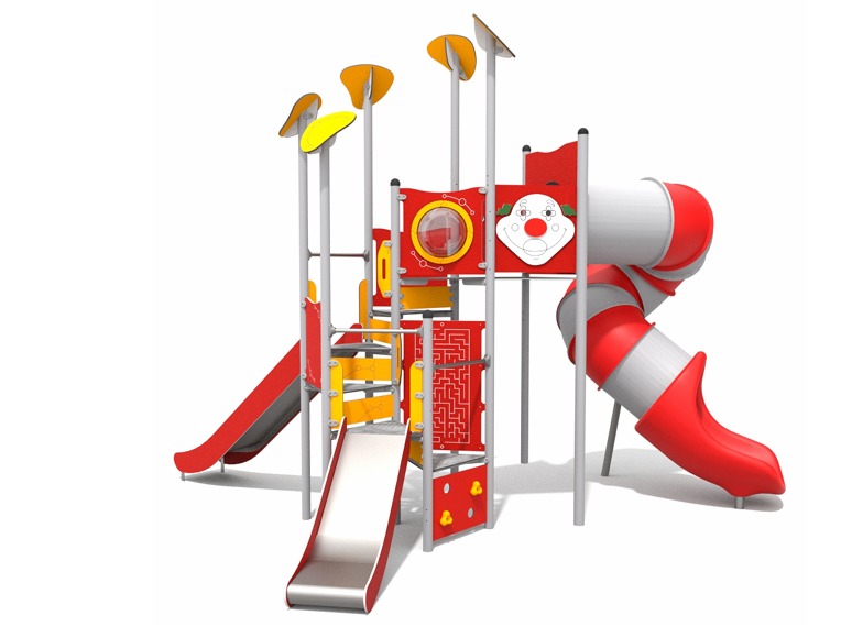 Kombinasjonsapparat med plattform i 6 trinn, 3 rutsjebaner, aktivitetspaneler og en liten klatrevegg.