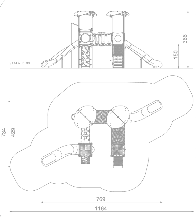 Stort kombinasjonsapparat med gangbroer, 2 rutsjebaner, brannmannstang, klatrevegg, trapp, spillpanel og handledisk.