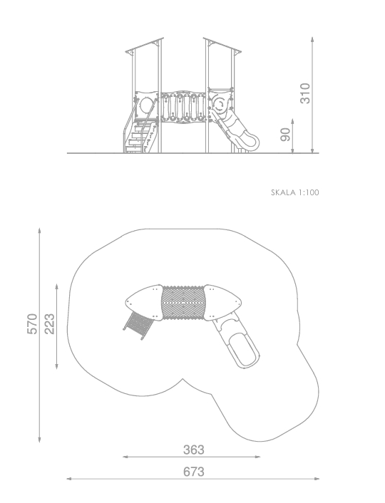 Kombinasjonsapparat /Aktivitetsapparat med utkikksvindu, sklie, trapp og stor plattform med god plass til mange på lekeplassen.