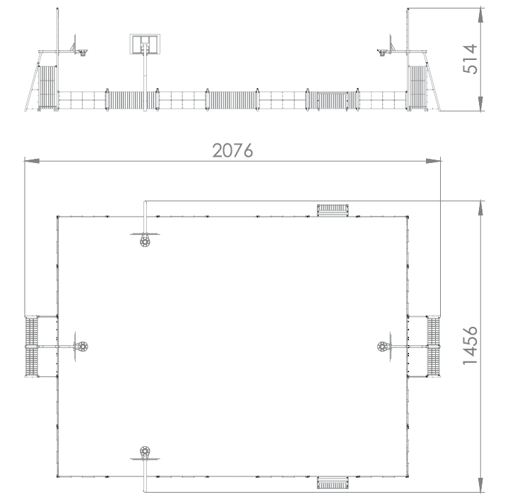Større ballbinge med 2 små mål, 2 store mål, 4 basketkurver og ekstra høy vegg på kortsiden.