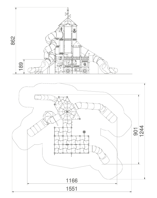 Tre etasjer og flere nivåer, plexiplast vinduer med flotte motiver, trapper, tre tunnelsklier,, klatrevegg, brannmannstang, klatreribber, turnstenger og mye mer.