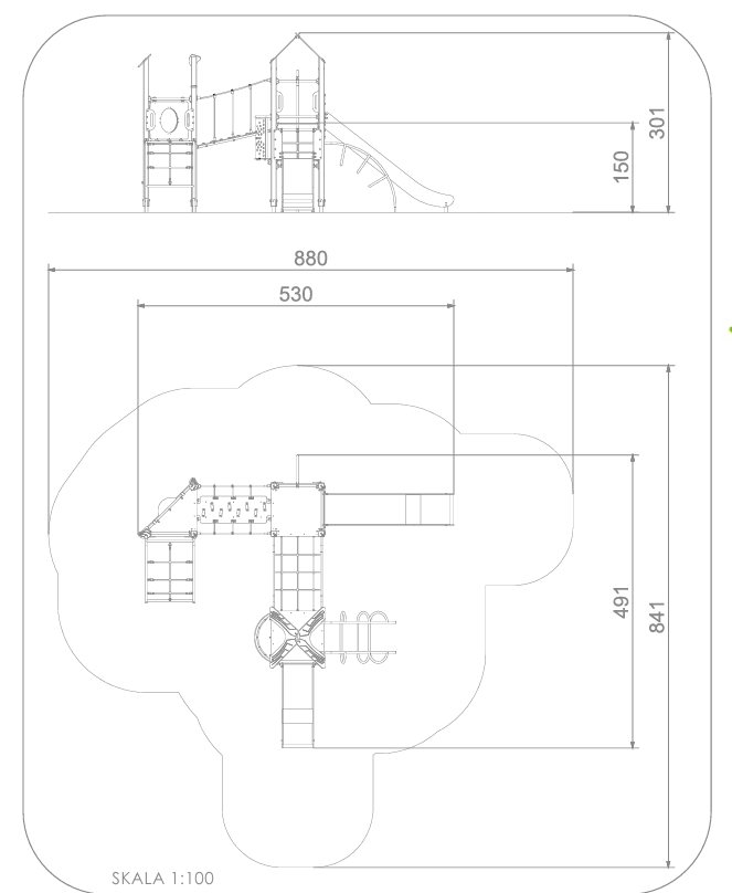 Kombinasjonsapparat med 3 plattformer, taubro, gangbro, 2 rutsjebaner, brannmannstang, klatrenett og trapp.