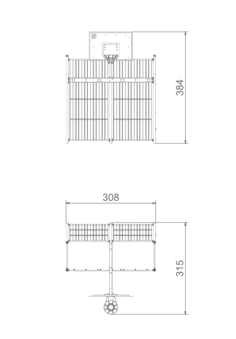 Mål i håndballstørrelse med basketkurv. Stativet er i galvanisert og lakkert stål med bakplater og sideelementer i HDPE-plast.