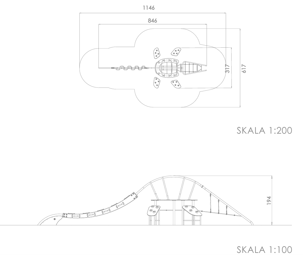 Spennende klatreapparat formet som en svaneøgle med klatreramper, balansegang, nett og sittebenker.
