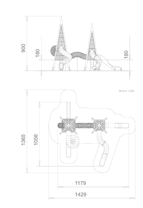 Tre tunnelsklier, rutsjebane, stiger og kryptunnel i polstret wire og rustfritt stål.