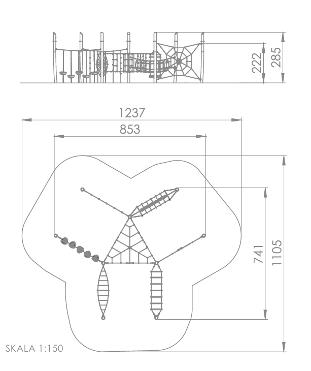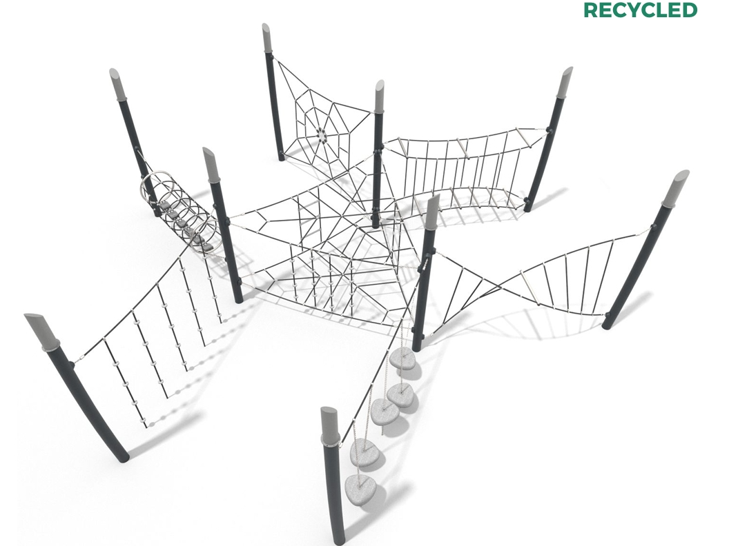 Stort aktivitetsapparat med lianegang, klatretau, gangbro, wiretunnel, edderkoppnett, vridd nett og 2 liggende nett med taustige og klatretau.