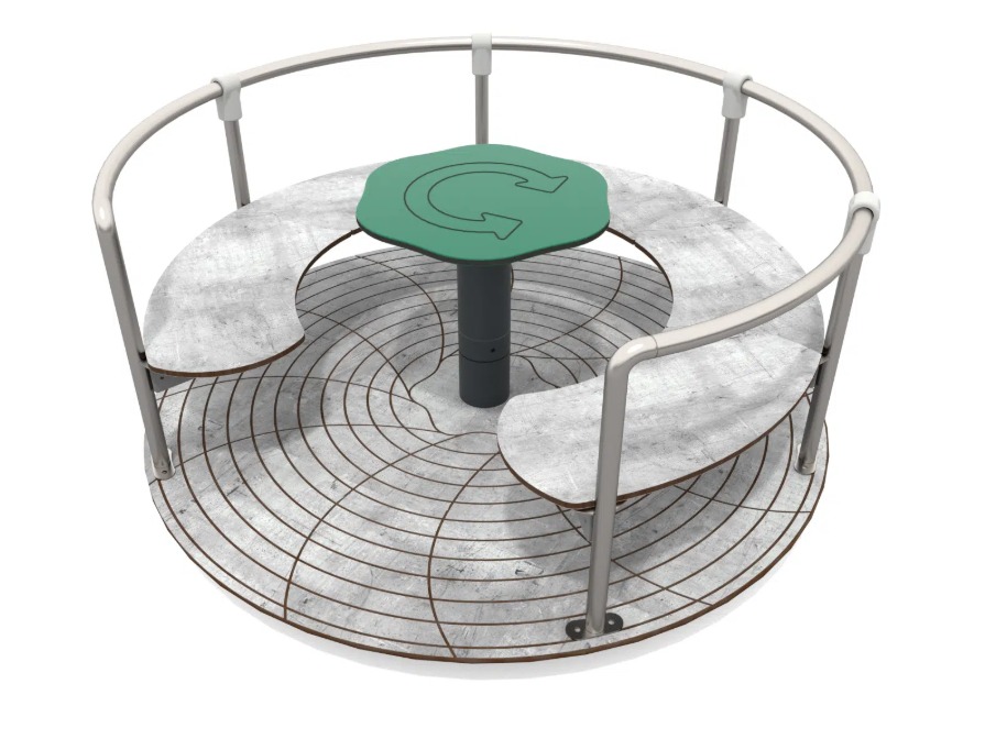 Karusell med plass til 5, med sittebenker og hjul til å justere farten med i midten.