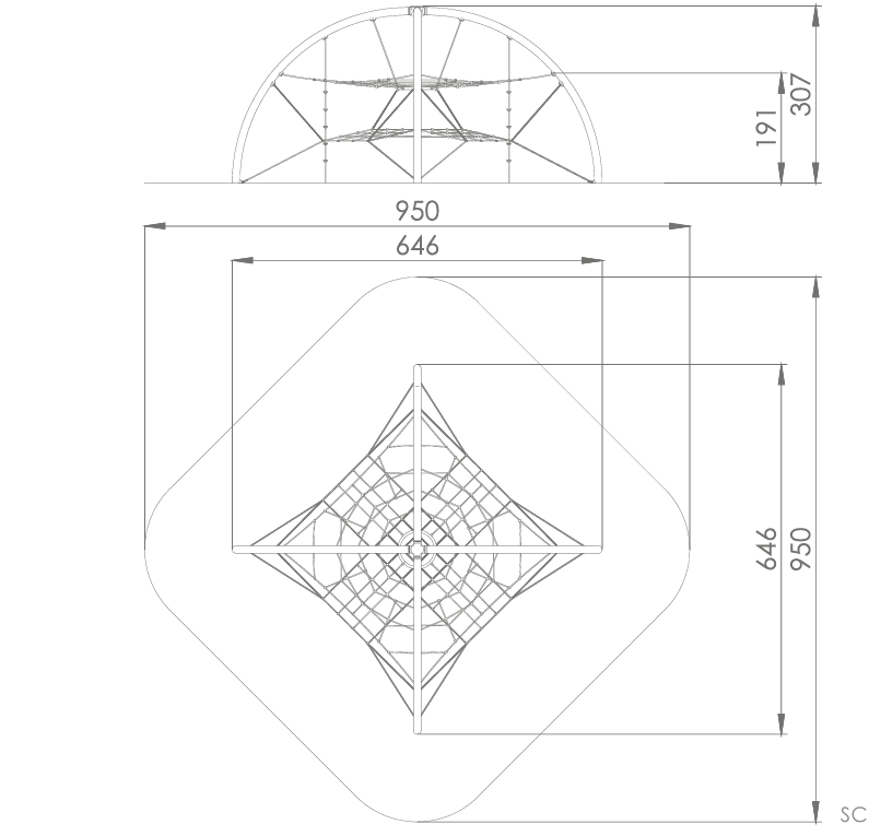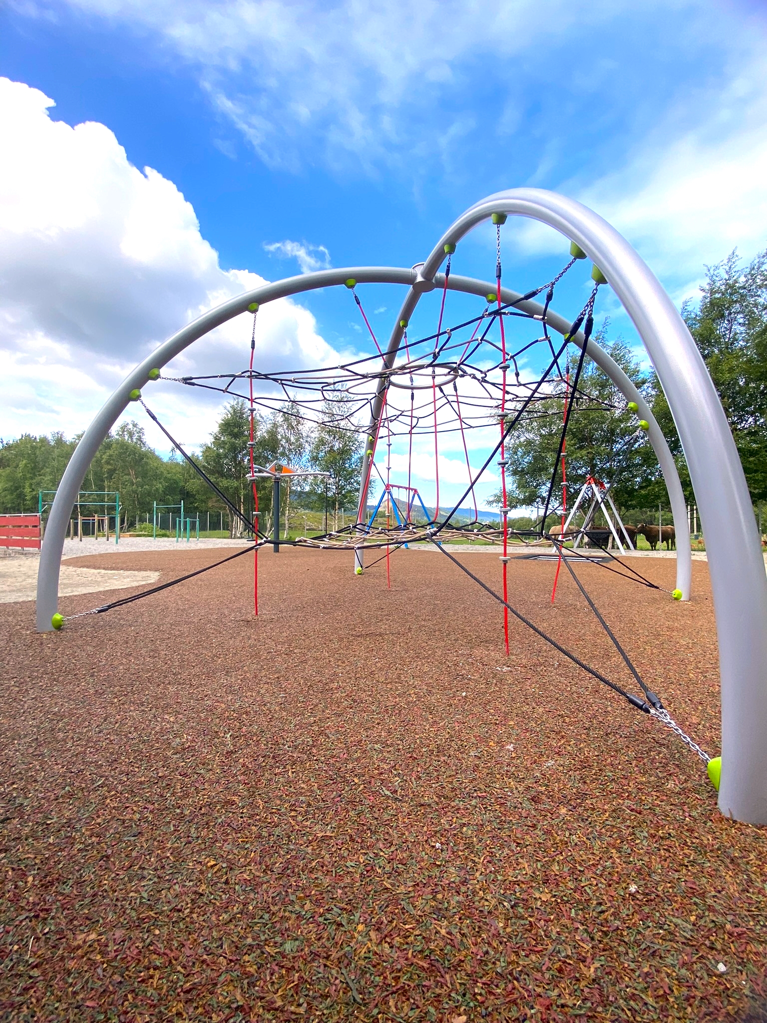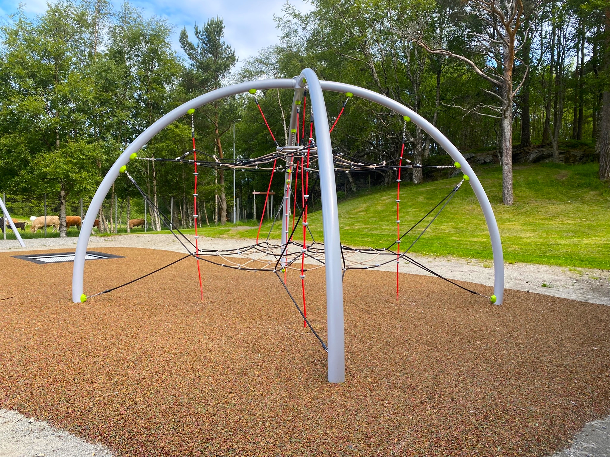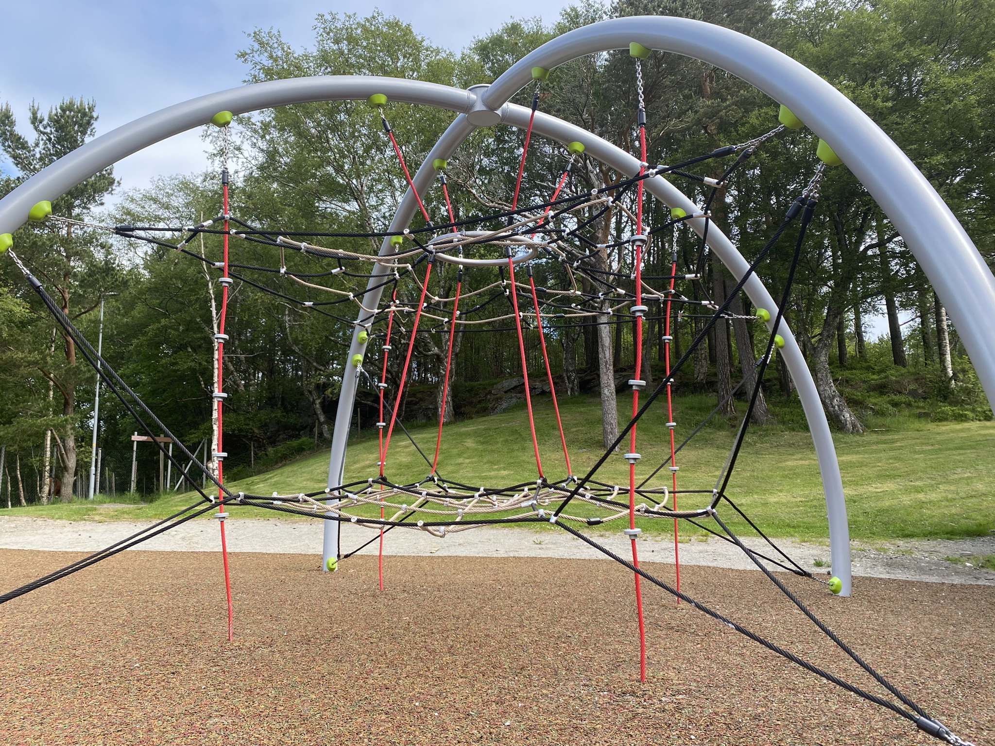 3 meter høyt klatreapparat, med klatretau og liggende nett.