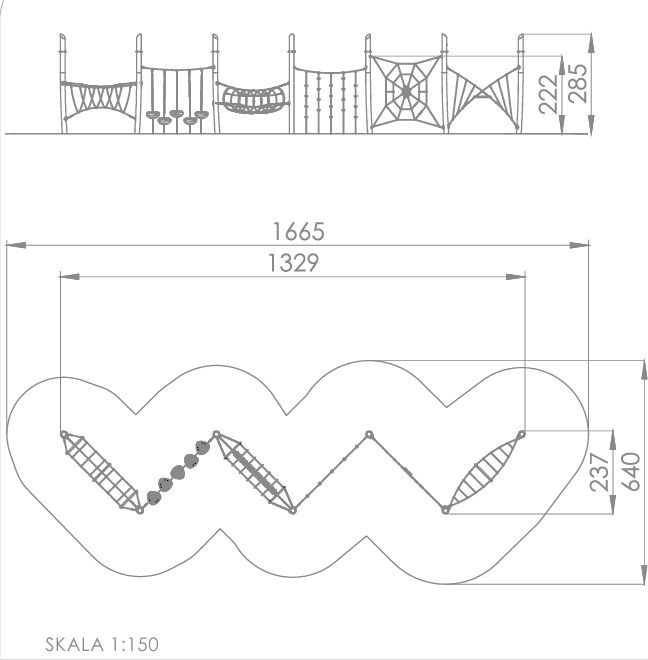 Klatreapparat med taubro, lianegang, wiretunnel, klatretau, edderkoppnett og vriddnett.