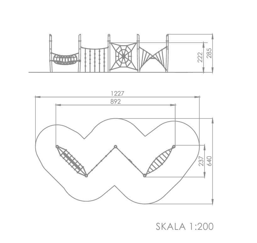 Aktivitetsapparat med klatrenett/edderkoppnett, wiretunnel, klatretau og vridd nett.