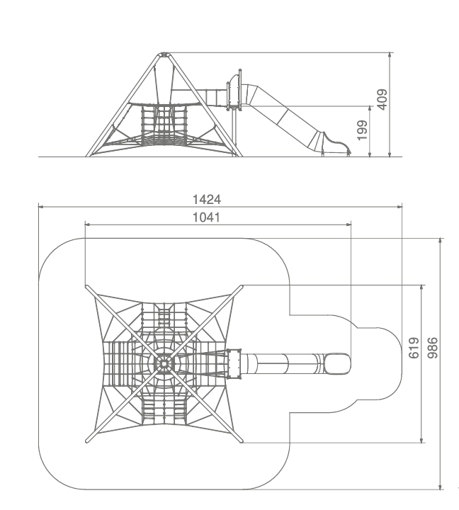 Produktet er et tredimensjonalt klatrepyramide, og du kan klatre I alle retninger, både utvendig og invendig. En tunellsklia kompletterer anlegget.