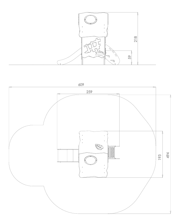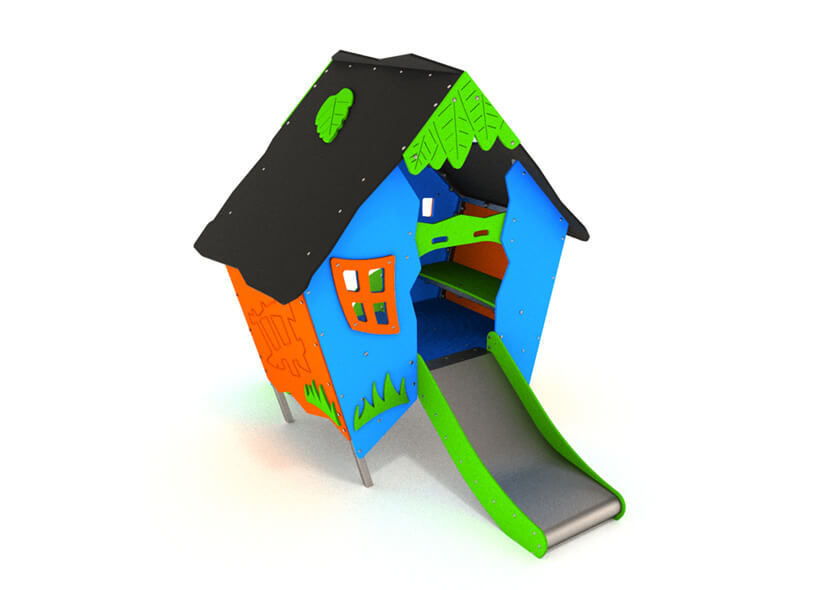 Lekehytte med innvendige benker, vinduer, rutsjebane og trapp.