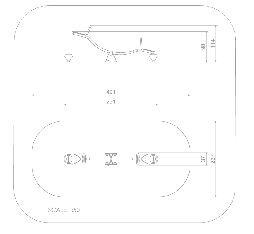 Vippehuske med 2 seter og demping. Vippen er laget av HDPE plater, pulverlakkert stål og gripevennlige håndtak.
