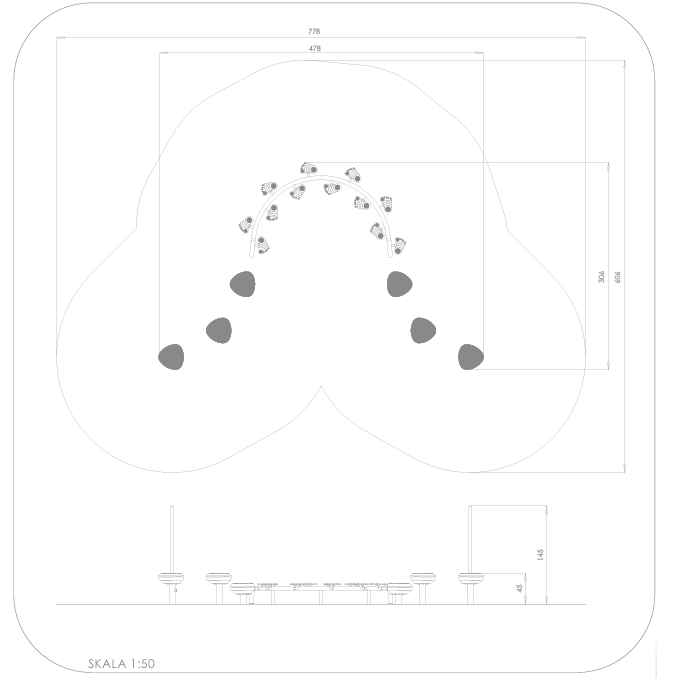 Balanseløype med balansesopper, buet balanselek, og minikaruseller. Hvert enkelt komponent leveres ferdig sammenskrudd, klar for nedstøp.
