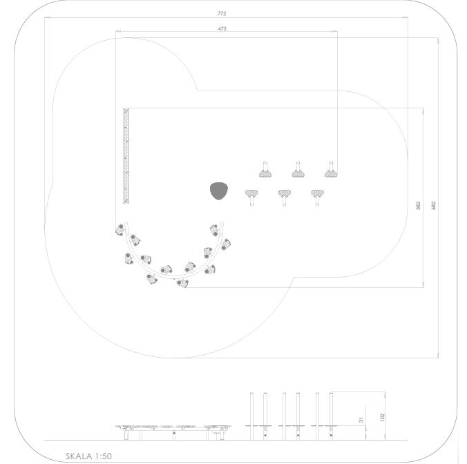 Balanseløype med ministylter, balansestokk og buet balanselek. Hver enkelt komponent leveres ferdig sammenskrudd, klar for nedstøp.