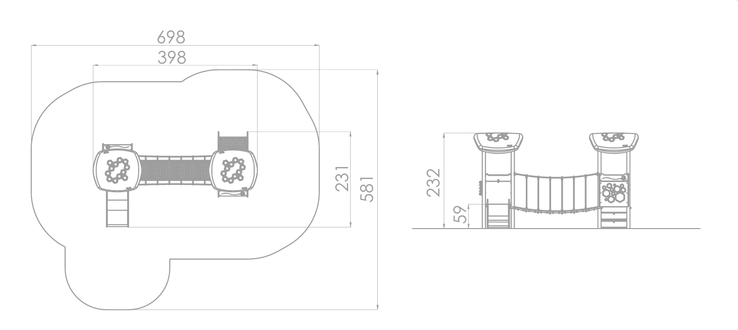 2 lekehus med lang gangbro, aktivitetspaneler, trapp og skile.