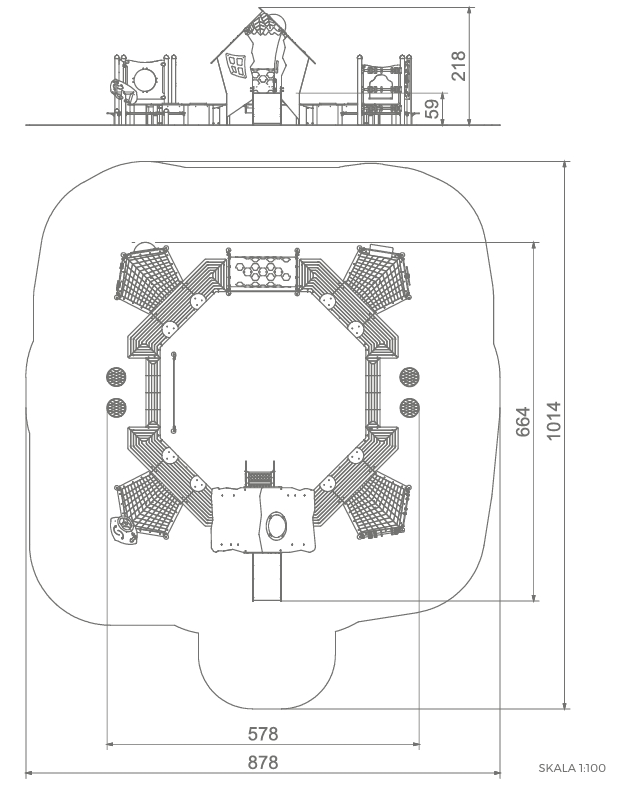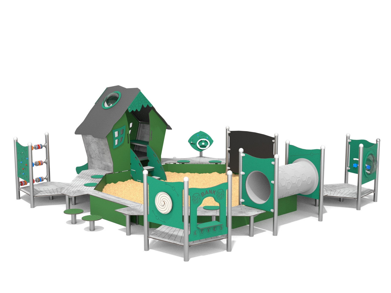 Stor lekesentral bygget rundt en sandkasse. Lekehytte med trapp, sittebenker og sklie. Flere plattformer og sitteplasser, kryptunnel samt spill- og aktivitetspaneler. En hel liten lekeplass med plass til mange barn!