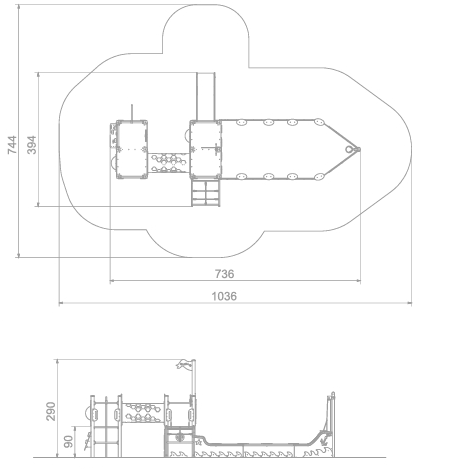 Stor flott piratbåt med sandkasse, plattformer, rutsjebane, stiger, sandbøtte, brannmannstang, aktivitetspaneler m.m. Her er det plass til hele barnehagen eller skoleklassen.