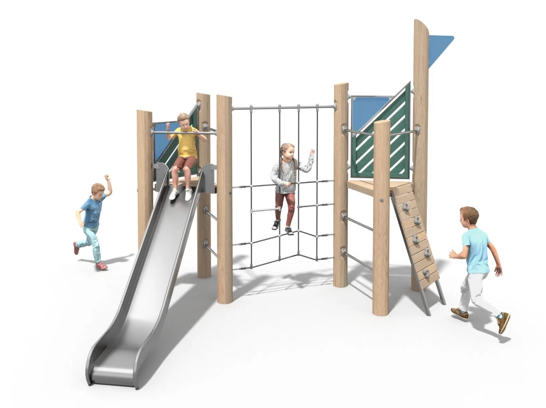 Klatrekombinasjon med sklie, plattformer og masser av moro.