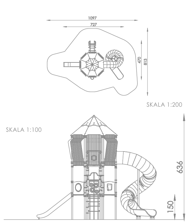 Stort leketårn på hele 6,36 meter! Med tunnelsklie, rutsjebane, 2 etasjer, klatrestige og mye mer.